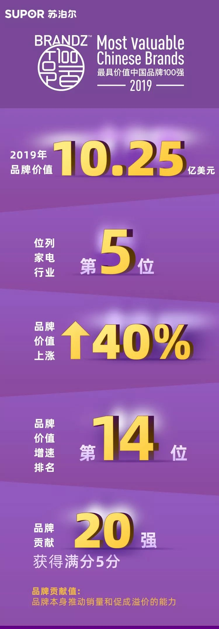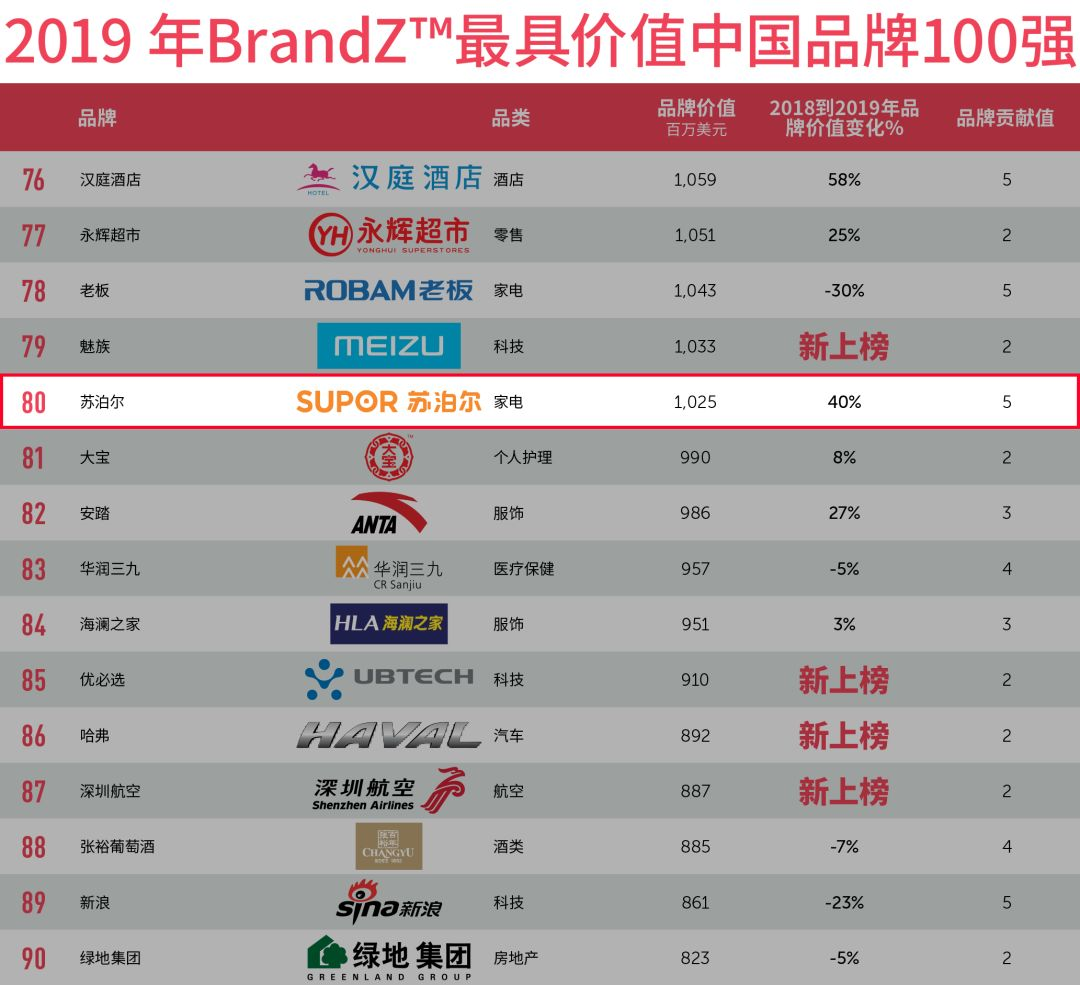 2019年 BrandZ?最具價值中國品牌100強排行榜發(fā)布,蘇泊爾連續(xù)7年上榜,品牌價值10.25億美元,位列家電行業(yè)第5位。