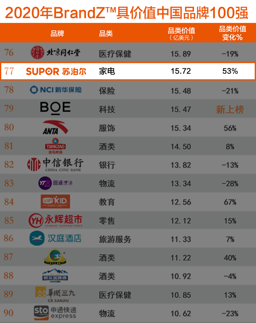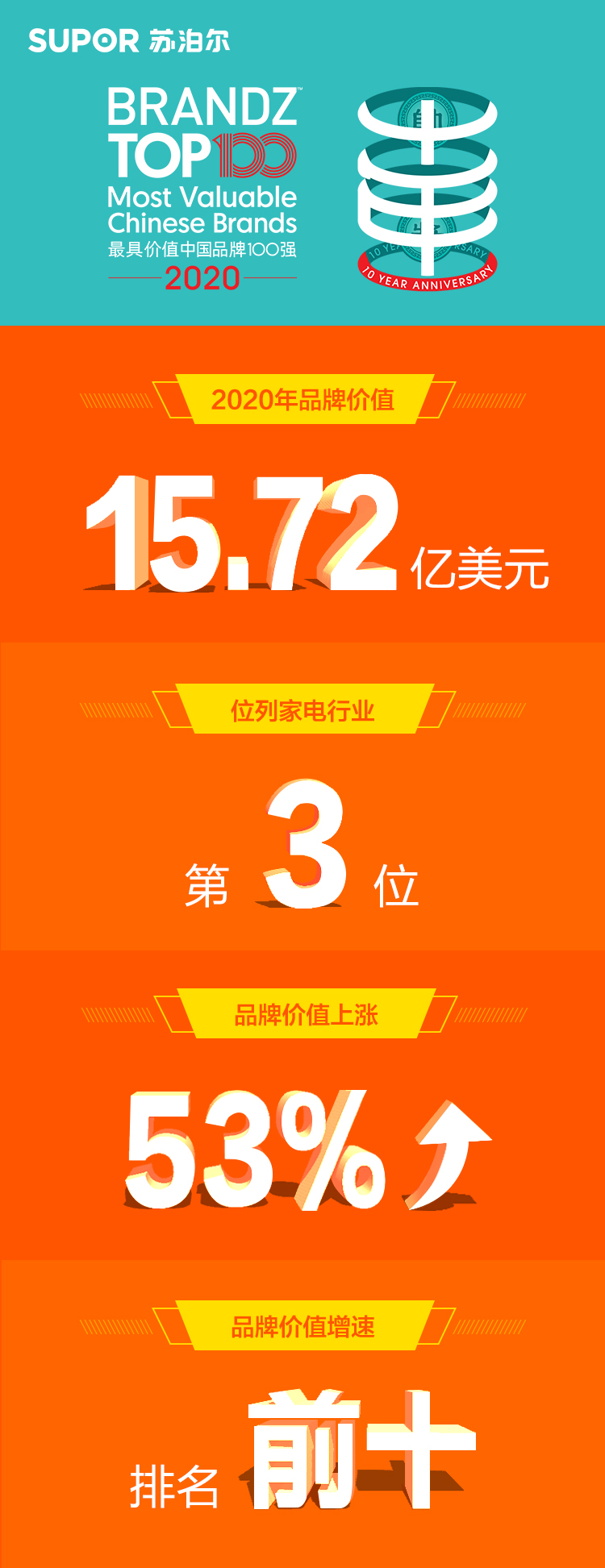 蘇泊爾連續8年上榜,品牌價值達15.72億美元,位列家電品牌第三,品牌價值再創新高。同時,品牌價值較去年增長53%,入圍品牌價值增長十強,家電行業增速第一!