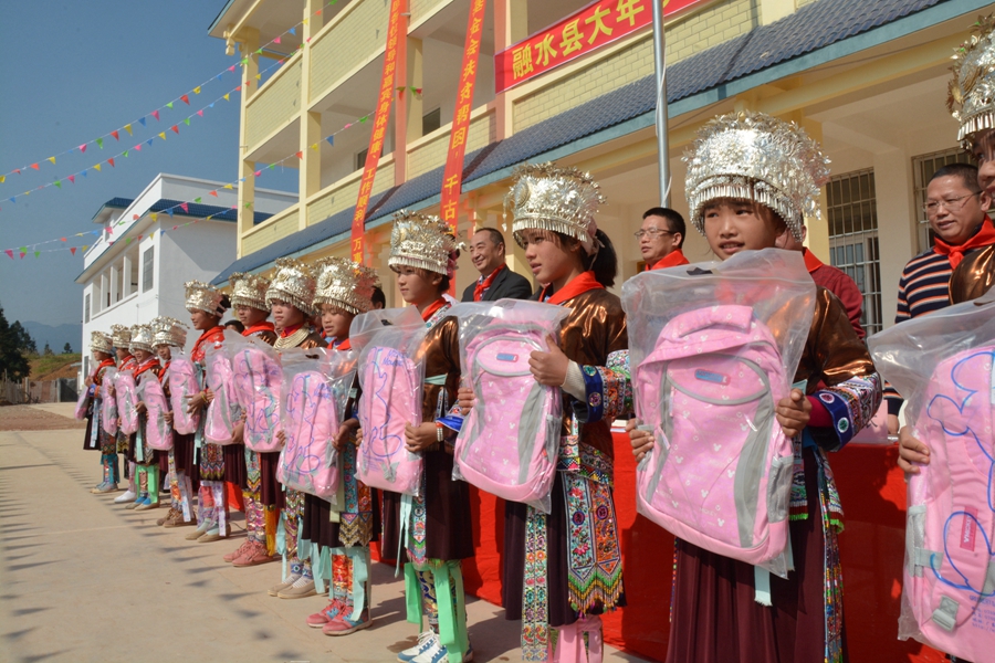 12月8日,這一天早上,林浪村的孩子們一大早就起床了,女孩子們穿上了節(jié)日盛裝,著苗衣,戴頭飾。今天是一個(gè)特別的日子,林浪小學(xué)要舉行落成典禮,迎來遠(yuǎn)方的客人。此時(shí),蘇泊爾公司總裁戴懷宗一行,沿著融水縣境內(nèi)的蜿蜒山路,顛簸奔波了四個(gè)半小時(shí),來到林浪村。