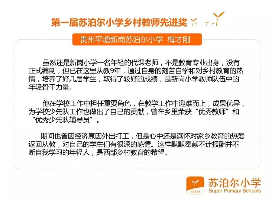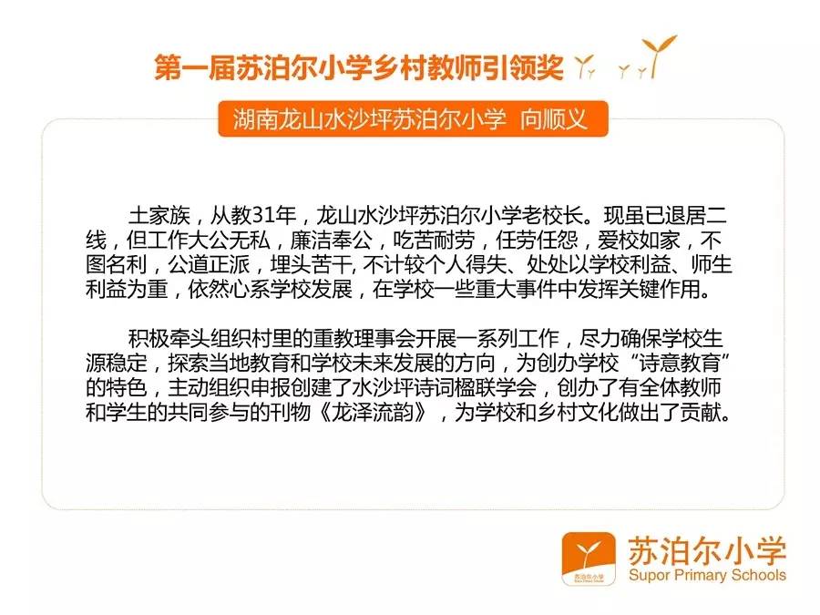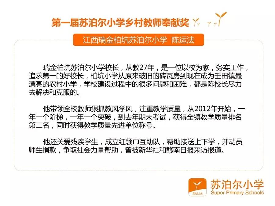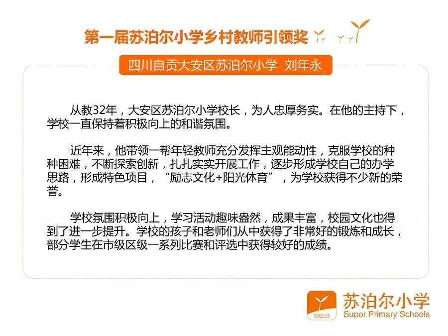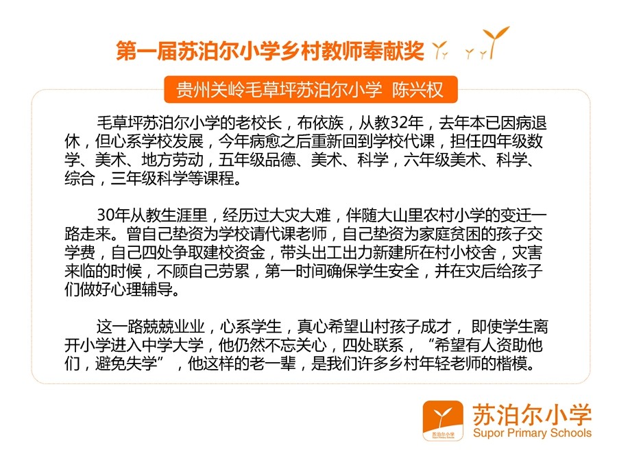 此次獲獎(jiǎng)的老師分別是貴州關(guān)嶺毛草坪蘇泊爾小學(xué)陳興權(quán)老校長(zhǎng)、江西瑞金柏坑蘇泊爾小學(xué)陳運(yùn)法校長(zhǎng)、四川劍閣鹽店蘇泊爾小學(xué)王清秀老師、貴州平塘新崗蘇泊爾小學(xué)梅才剛老師、青?;ブ始冶ぬK泊爾小學(xué)王生奎老師、四川自貢大安區(qū)蘇泊爾小學(xué)劉年永校長(zhǎng)、湖南龍山水沙坪蘇泊爾小學(xué)向順義老校長(zhǎng)、云南龍陵平達(dá)蘇泊爾小學(xué)楊成光校長(zhǎng)。