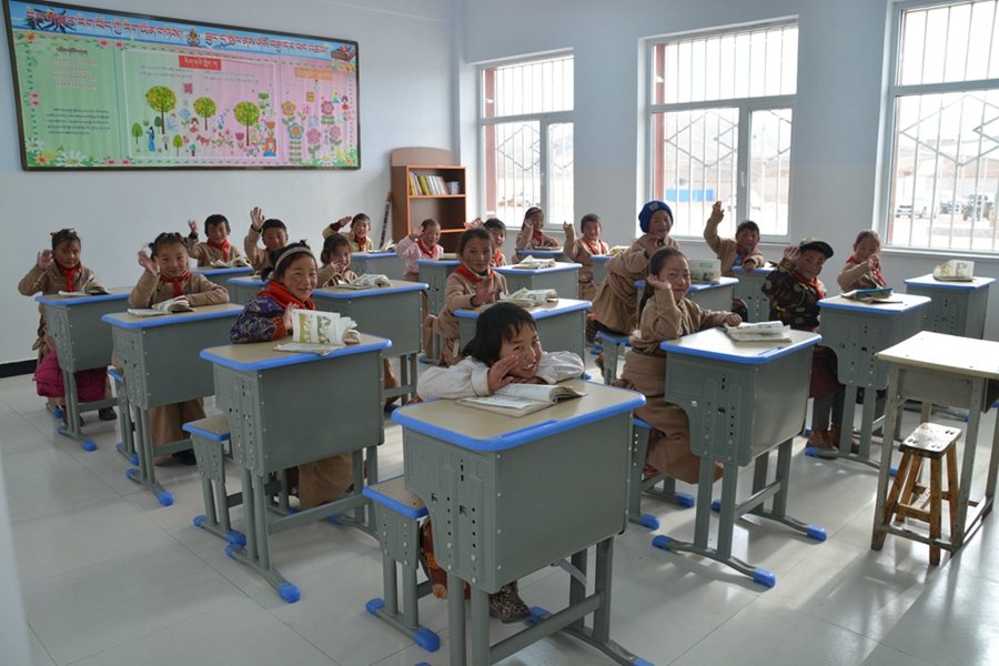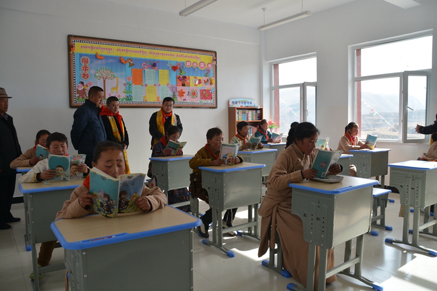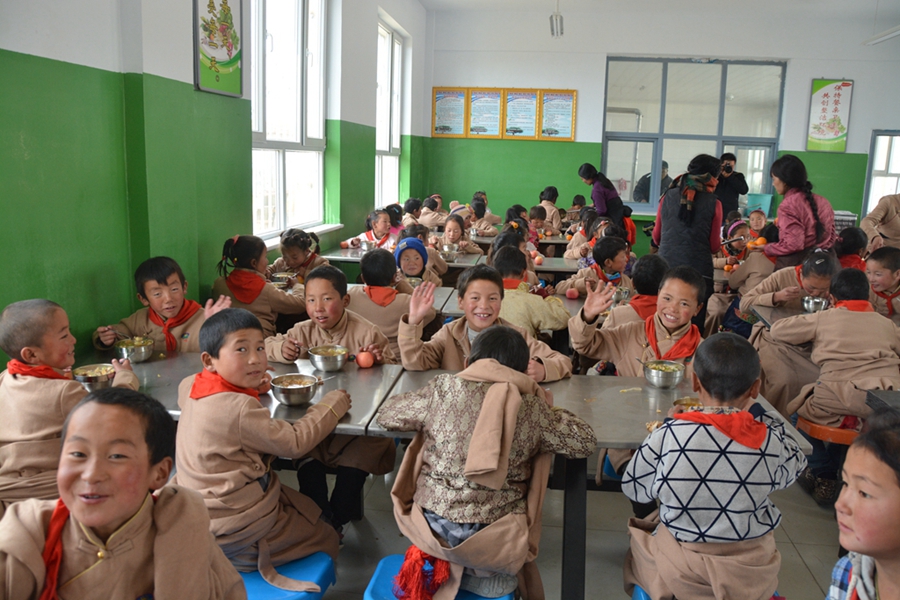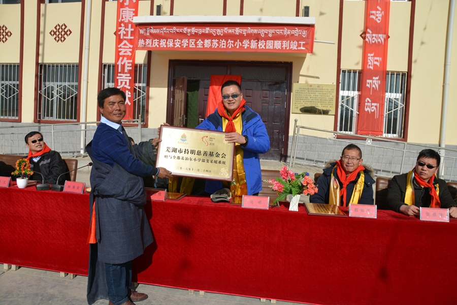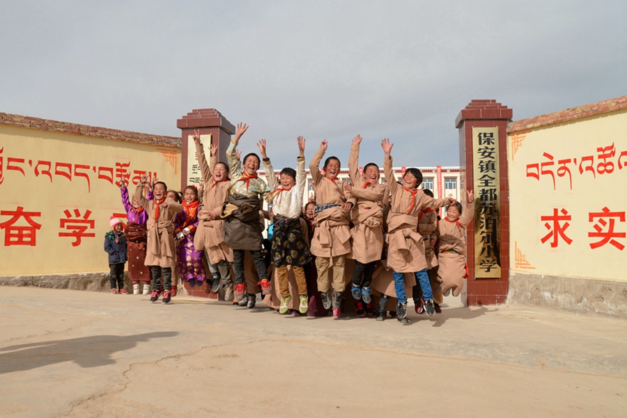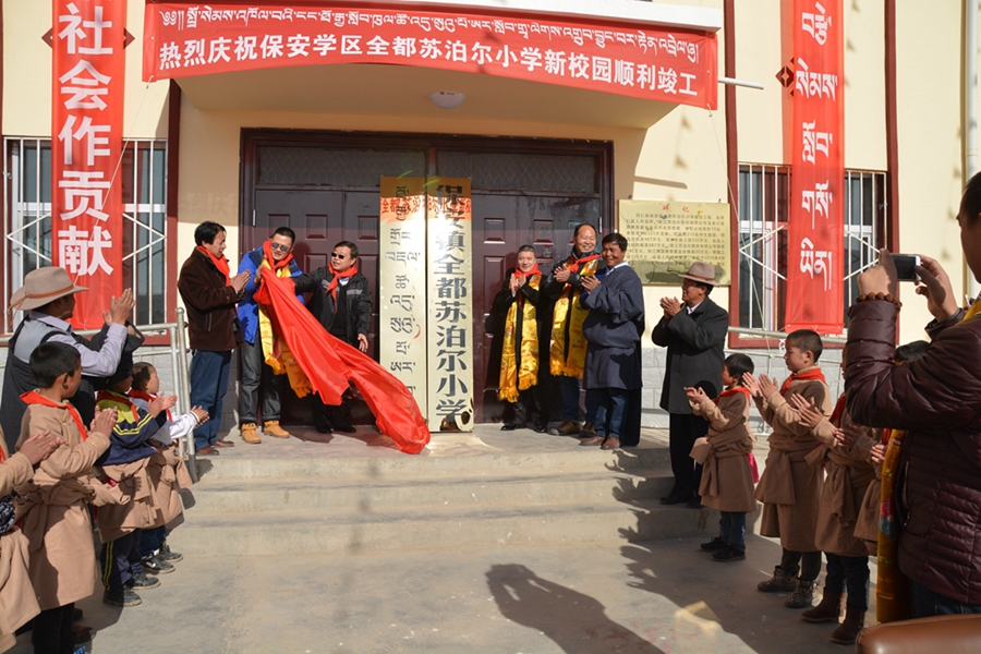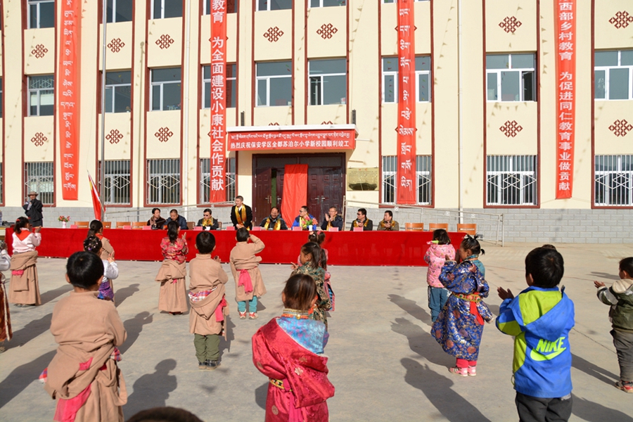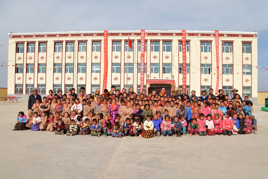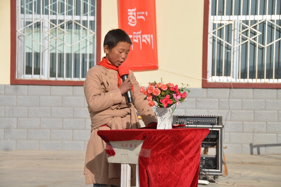 陽光與愛心一樣溫暖,藍天如孩子一樣純凈。六年級的男孩完瑪加今天代表小朋友們在落成典禮上發言,用質樸的語言講述他的心聲。“以前我和我的同學們在燈光昏暗、墻皮脫落、屋頂透風的教室里學習,在坑坑洼洼的操場上玩耍,端著碗蹲在沒有遮擋的墻根吃飯,冬天還要忍受寒風的肆虐。在那樣艱苦的環境中我們一起并肩前行,度過了六年的時光。如今,我們的新學校盛裝打扮,教學樓拔地而起,國旗高高飄揚,操場平整如紙,教室溫暖明亮,食堂整潔雅致,還有藏書豐富的圖書室。今后我們將在這樣美好的環境中學習生活,我心中充滿了喜悅和感恩。”