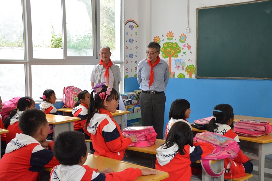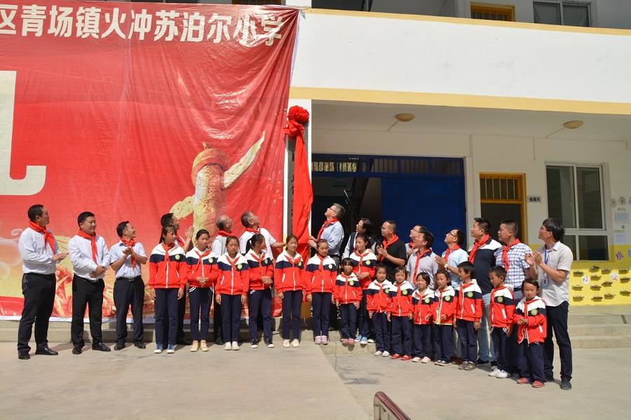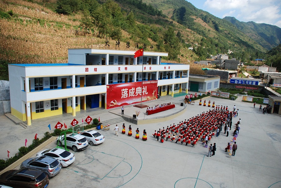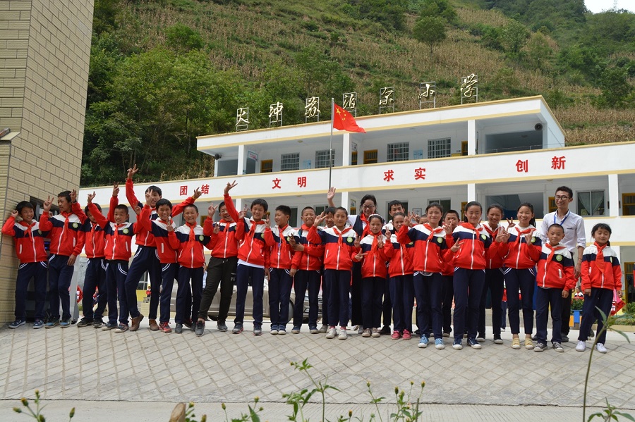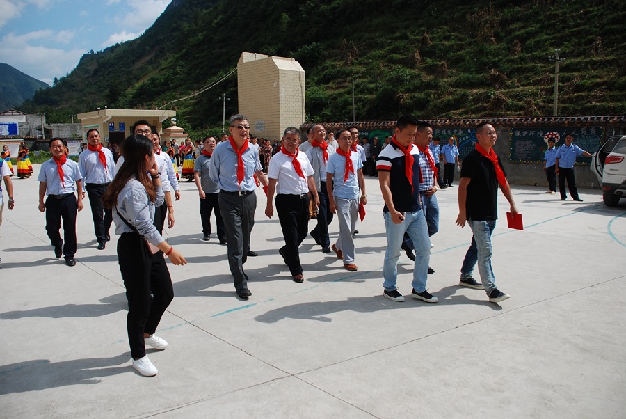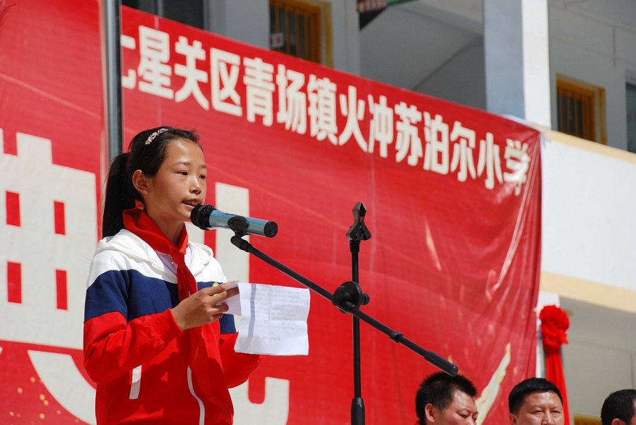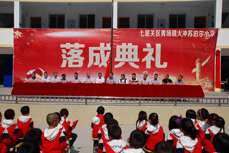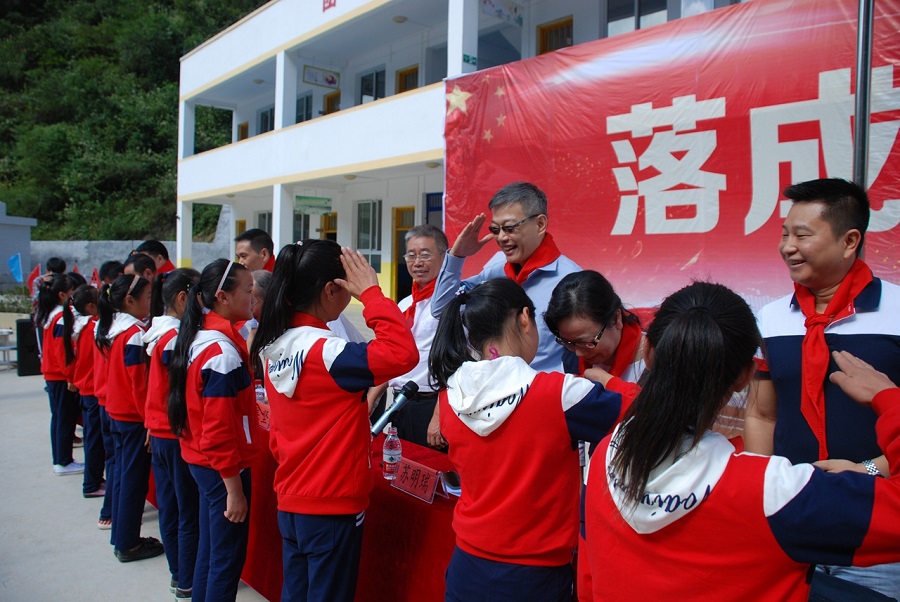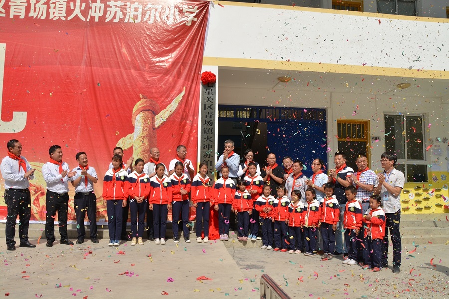 就在9月27日的這一天,火沖蘇泊爾小學迎來了期待已久的落成典禮,蘇泊爾公司首席運營官蘇明瑞先生、碩源基金會陳珊珊女士與蘇泊爾貴州區域聚鋆浩、華輕、宇成發、聚才、紅星旺達、尚東、博偉等七家經銷商伙伴一同來到畢節火沖村,和師生們共同慶?;饹_蘇泊爾小學的落成。典禮在國歌聲中拉開了序幕,少先隊員們給遠道而來的叔叔阿姨們獻上了紅領巾,向大家表示歡迎。