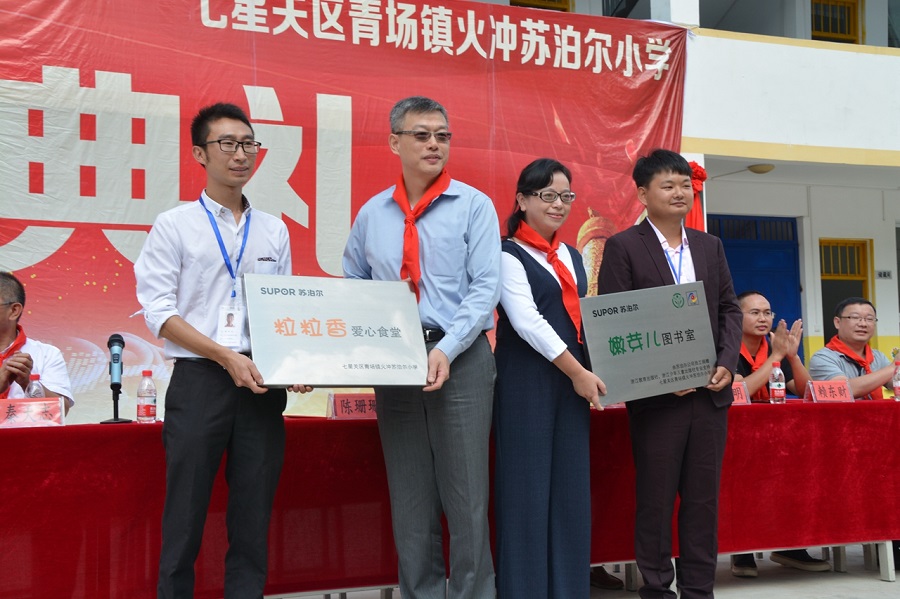 此外,每所蘇泊爾小學,公司都還會為其捐贈圖書配備“嫩芽兒”圖書室和建設“粒粒香”愛心食堂。典禮上,公司蘇總和碩源基金會陳女士向學校校長和主任授予圖書室和愛心食堂的標識牌,希望火沖村的孩子們讀更多的好書,吃更有營養的飯菜。