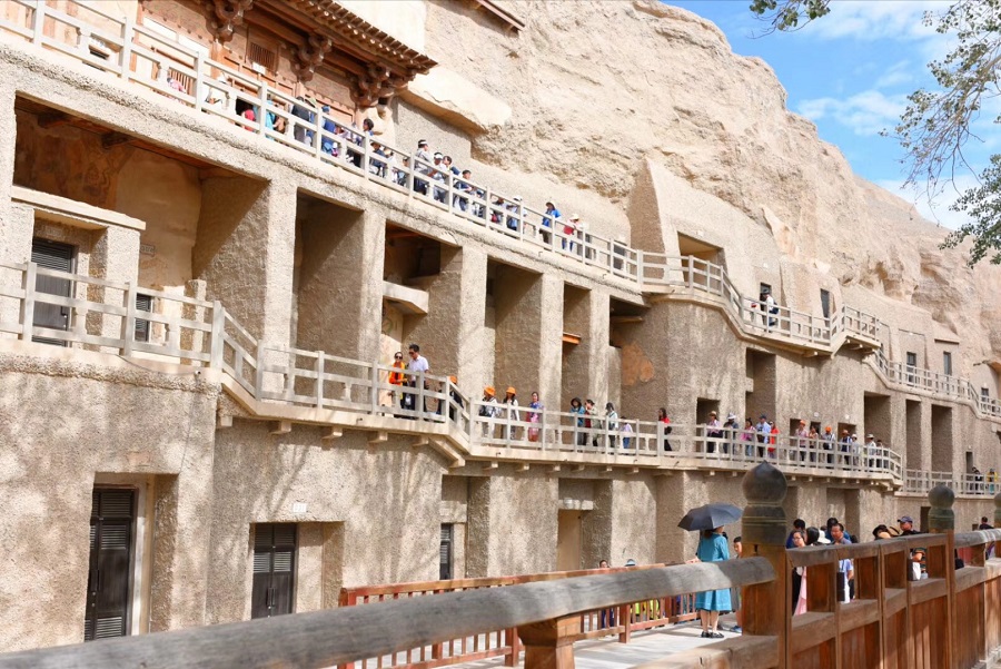巍巍千載敦煌,浩浩藝術大觀。老師們來到游學的最后一個游覽景點——敦煌莫高窟,這里是藝術的殿堂,一座石窟,是一個世界,一孔洞穴,是一截歷史。它見證了歷史滄桑,見證了世事變遷,也許老師們看完那一幅幅精湛的壁畫后,會不禁感覺這大漠,竟還有些溫柔。從人間煙火到凈土莊嚴,從凡俗糾纏到飛天翩然,匠人們將技藝融入虔誠,將畢生揮灑石窟,血汗辛勞,筑出俯視悲歡的靈光幻妙。