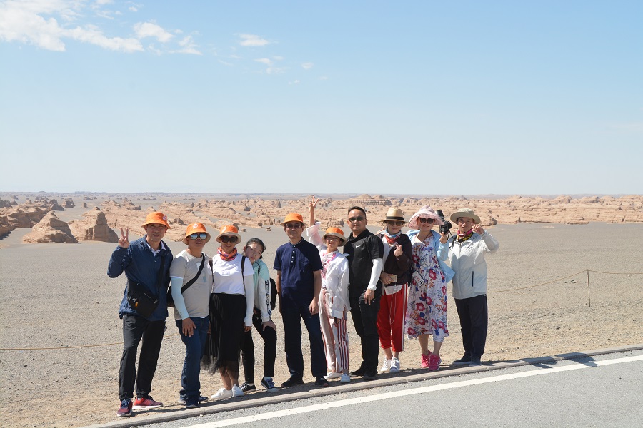 萬里敦煌道,三春雪未晴。送君走馬去,遙似踏花行。別過瓜州,繼續往西,老師們便來到河西走廊上最后一座節點城市——敦煌。歷來沙漠清泉難以共存,但在敦煌,卻能看到沙漠與清泉相伴相守。駝隊緩緩的走在落日下的大漠,鳴沙山下的綠洲,在大漠中是那樣的令人動容,不禁讓老師們眼前一亮。次日,老師們還去到了離敦煌城外不遠處的雅丹地質公園,感受著千萬年的自然沉淀,有種震撼人心的力量。