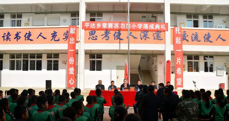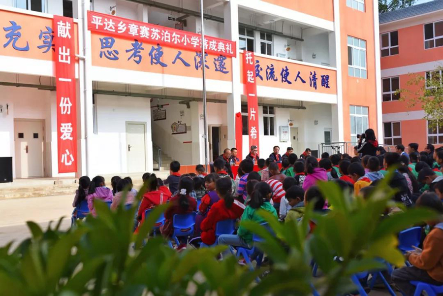 綠樹環抱之中的平達鄉章賽小學,這天迎來了特殊的客人。公司蘇總,品斛堂公司趙董一行,一大早從縣城出發,走過三個小時曲折漫長的盤山公路,來到學校看望孩子們。兩年前品斛堂一次慈善拍賣,促成了公司對章賽小學110萬元的捐資,促成了學校新教學樓和宿舍樓的建設,也促成了兩家企業這次共同的愛心之旅。