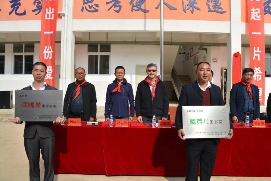 在師生熱烈的掌聲中,蘇總、趙董和徐縣長、余局長等共同為平達鄉章賽蘇泊爾小學揭牌,禮炮響起。這是繼2009年龍新鄉菜子地蘇泊爾小學、2012年平達鄉蘇泊爾小學之后,在龍陵縣內落成的第3所蘇泊爾小學。