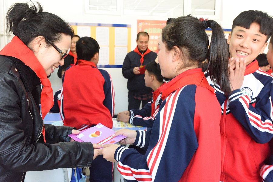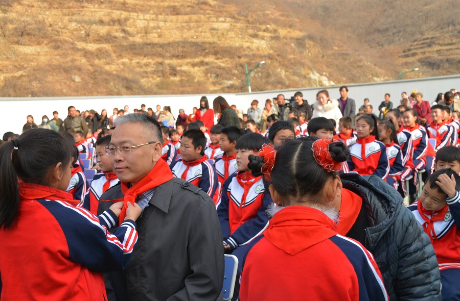 少先隊員代表給遠道而來的客人們佩戴紅領巾,用他們的方式表達對客人們的歡迎。
