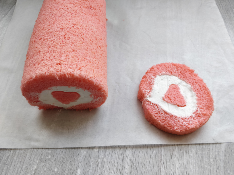 19. 將蛋糕胚從一端小心地卷起,蛋糕胚的另一邊切45度角,兩頭接口朝下放入冰箱冷藏片刻,定型后切塊就完成了。也可以在表面畫一些小的心形裝飾。