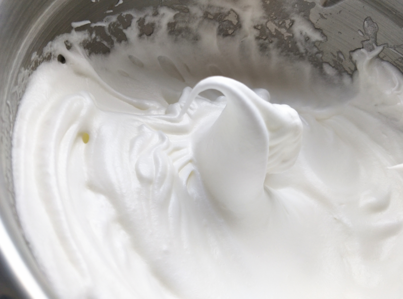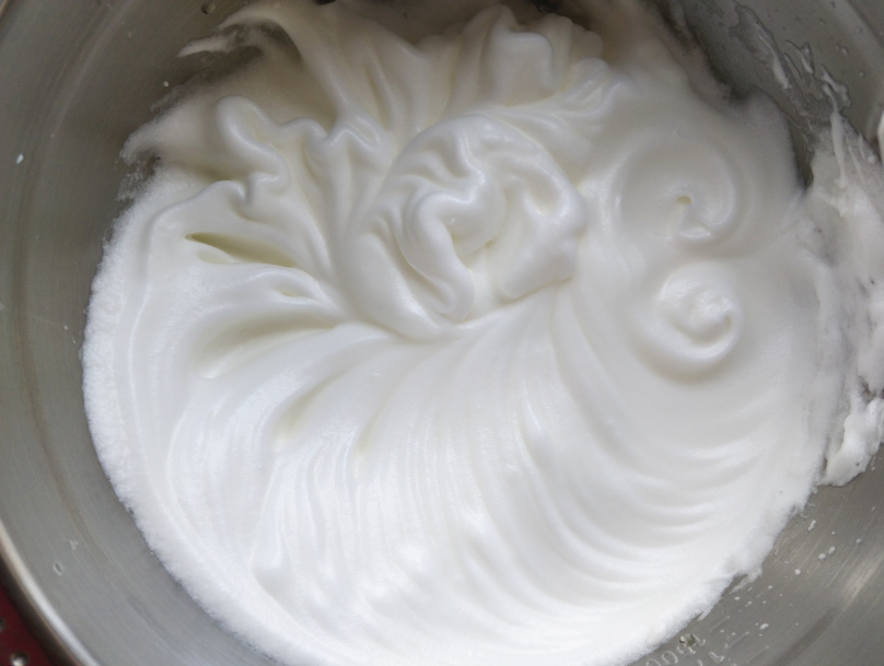 7. 把蛋清打發(fā)到如圖,提起打蛋器攪拌頭時(shí),能拉起大彎鉤的狀態(tài),蛋清的打發(fā)就完成了。蛋清的打發(fā)不要過度,過度的話蛋糕卷容易開裂,也不能打發(fā)不足,不足的話烘烤后會(huì)塌陷回縮。