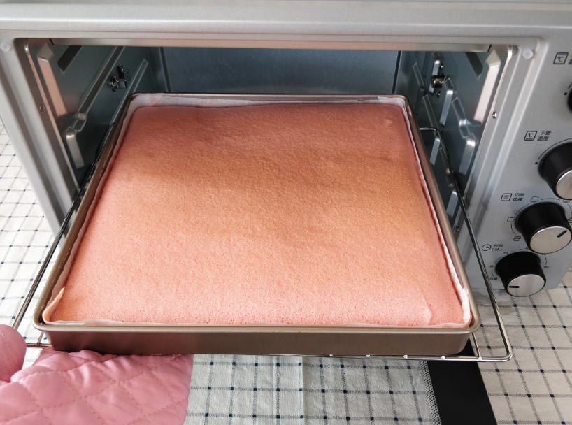 13. 將烤好的蛋糕胚從烤箱中取出,可以看到表面上色度和膨脹程度都比較均勻,這在容量30升的烤箱中還是表現(xiàn)不錯(cuò)的。