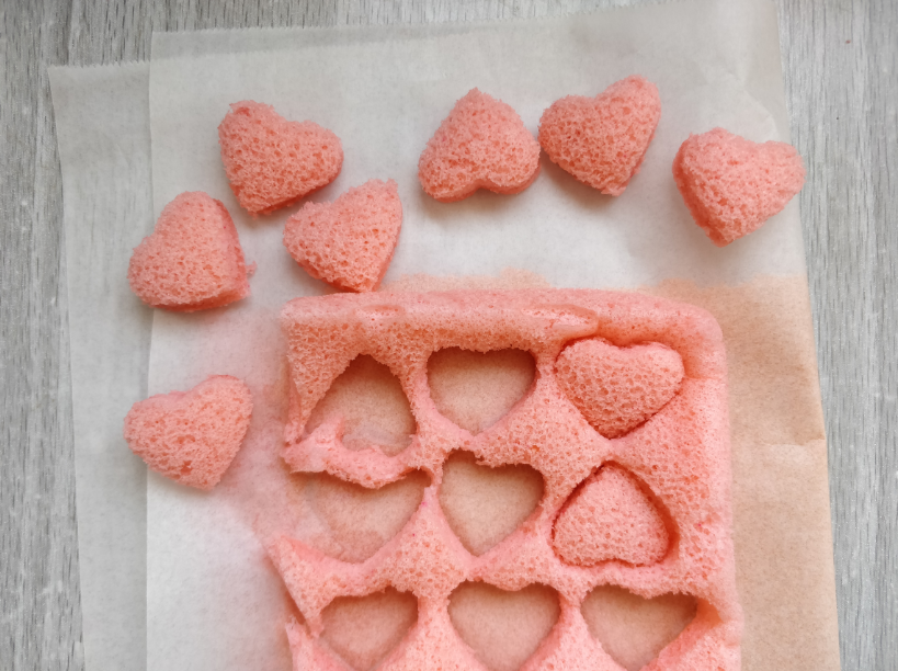 16. 準(zhǔn)備夾心:將蛋糕胚用刀切下5cm寬的一條,用心形切模刻出圖案。