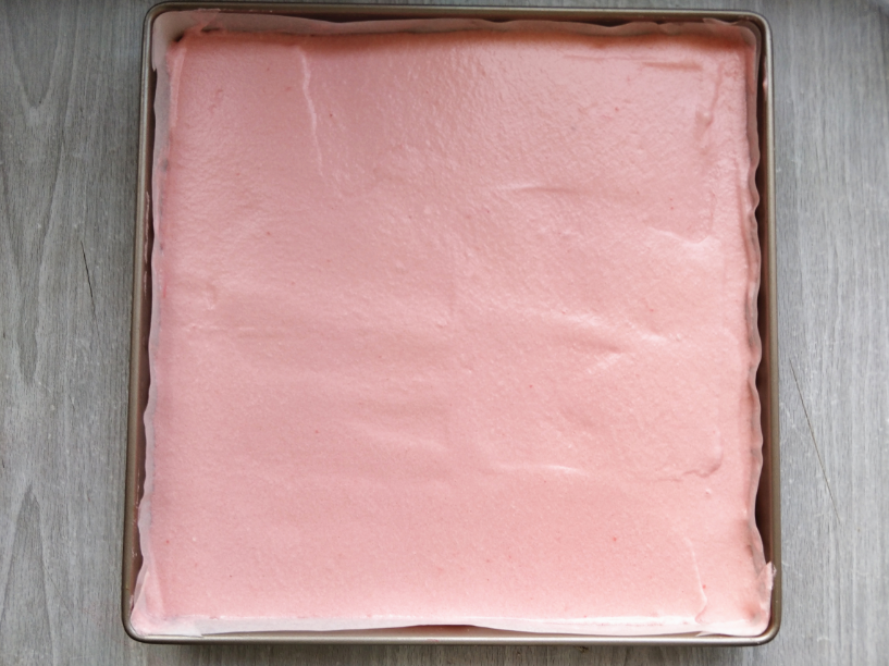 11. 將邊長(zhǎng)28cm的金盤中鋪好油紙,把蛋糕糊倒在油紙上,用抹刀將表面和四角都抹平。