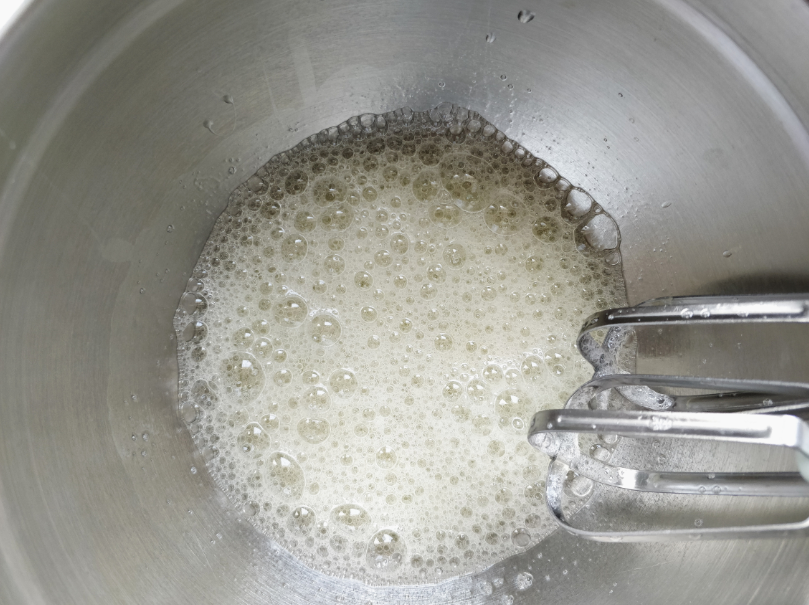 5. 打發(fā)蛋清:將蛋清用電動(dòng)打蛋器打發(fā)到魚眼泡狀態(tài)后,加入一半的細(xì)砂糖,繼續(xù)打發(fā)。
