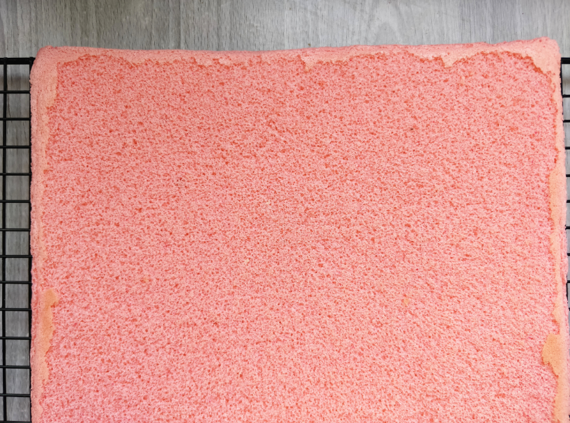 15. 待蛋糕胚晾涼后,撕掉油紙,蛋糕胚表面就成了完美的毛巾面。