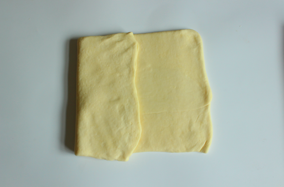 7. 搟面棍再輕輕搟成長方形,再左右對折。第一次4折完成。放冰箱冷藏20分鐘左右。