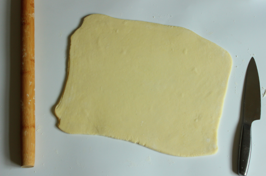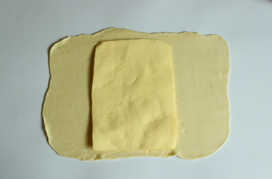 5. 取出松弛好的面團(tuán)搟成薄長方形面片。黃油片鋪在中間。