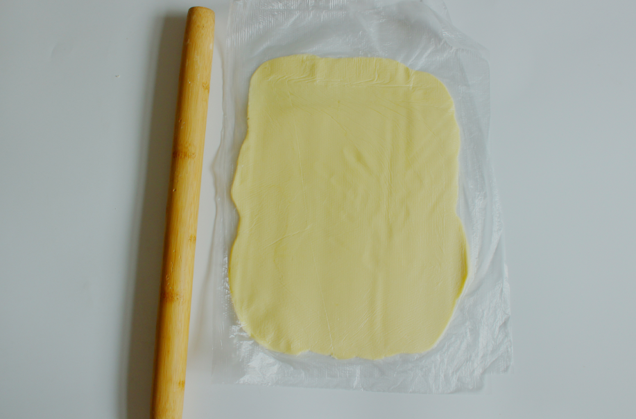 4. 上面再蓋一層保鮮膜,用搟面棍輕輕壓成長方形。