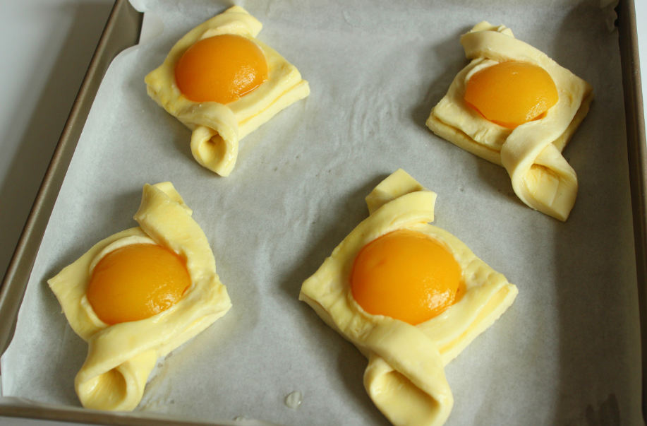 11. 中間壓一塊罐頭黃桃,靜置15分鐘左右。