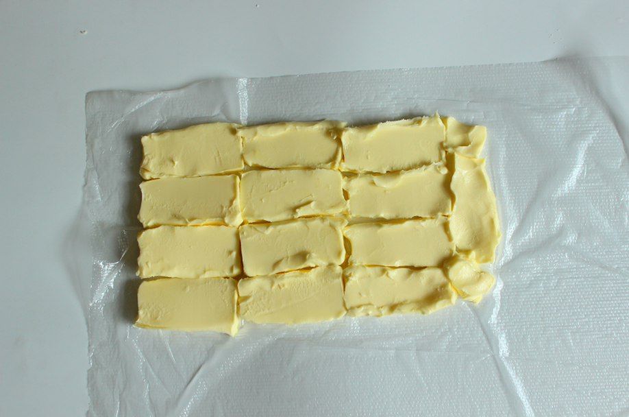 3. 將170克裹入所用黃油切片平鋪保鮮膜上。