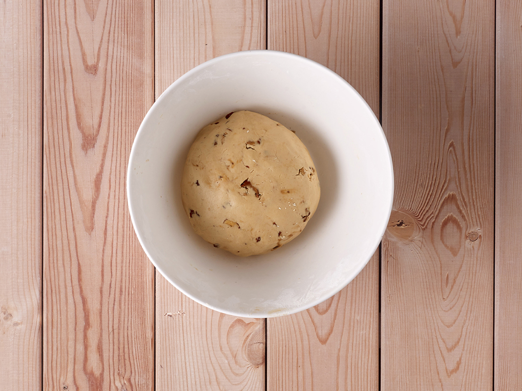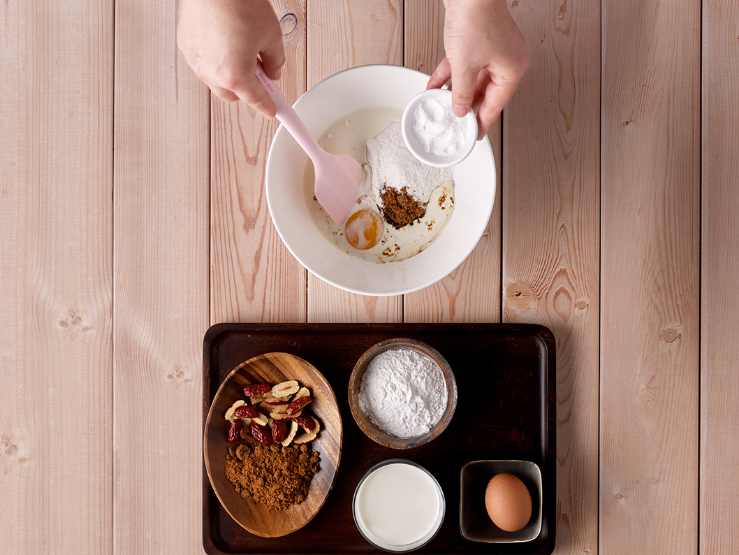 2、將糯米粉、牛奶、雞蛋、紅糖、泡打粉混合。紅棗丁加入一部分并攪拌均勻,醒發30分鐘;