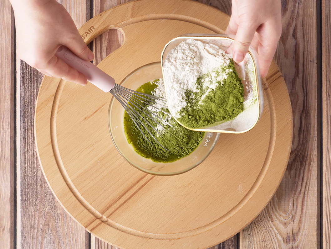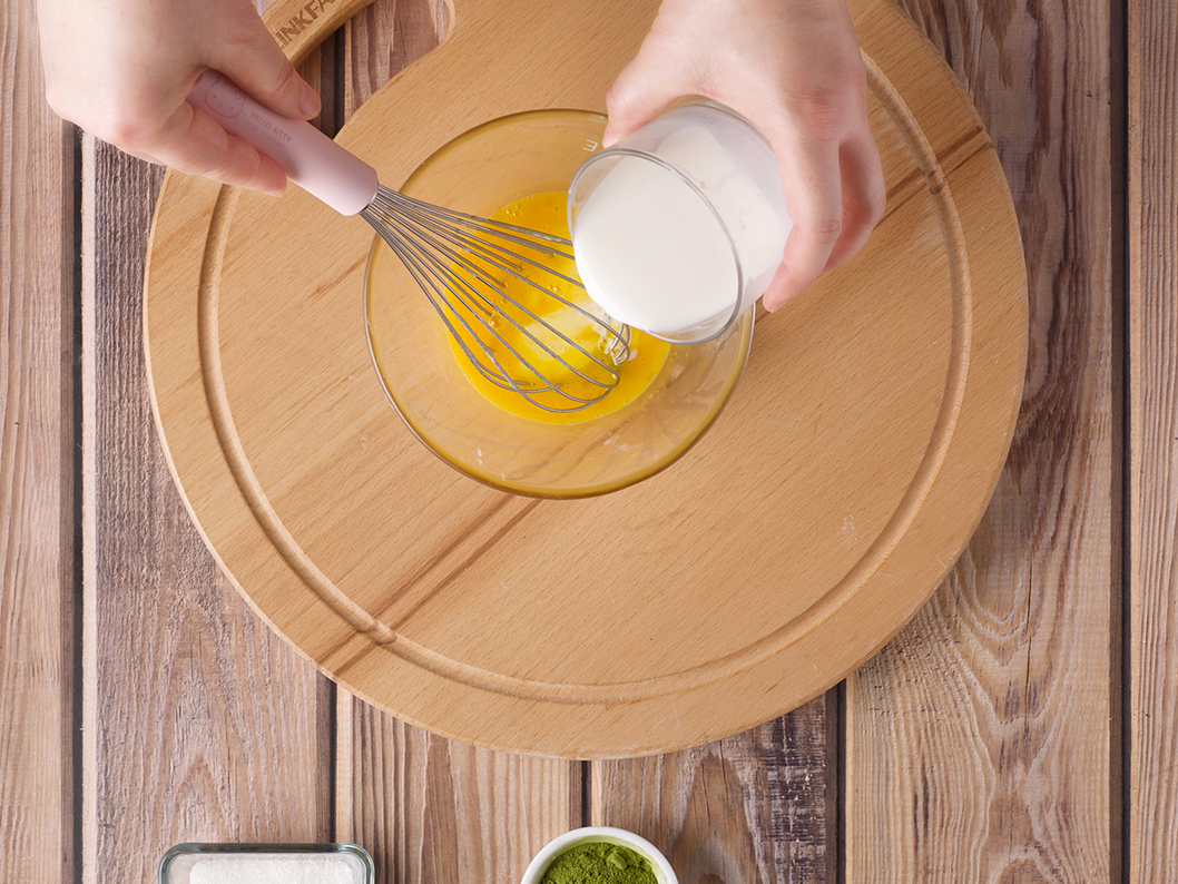 配料:牛奶195g、黃油15g、淡奶油200g、白糖50g、五十鈴抹茶粉4g