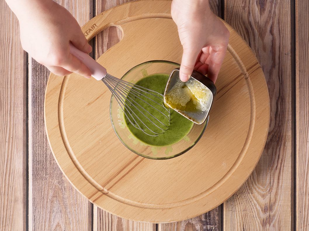 1、雞蛋加30克白糖打發(fā)至砂糖融化,加入牛奶攪拌均勻,抹茶粉和攪拌粉混合后,過(guò)篩至蛋奶液中,攪拌均勻后加入熔化的黃油,攪拌至無(wú)顆粒;
