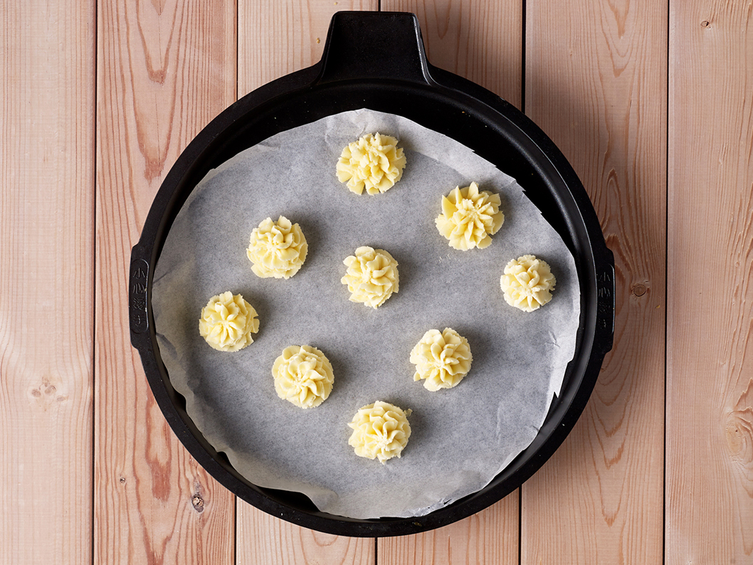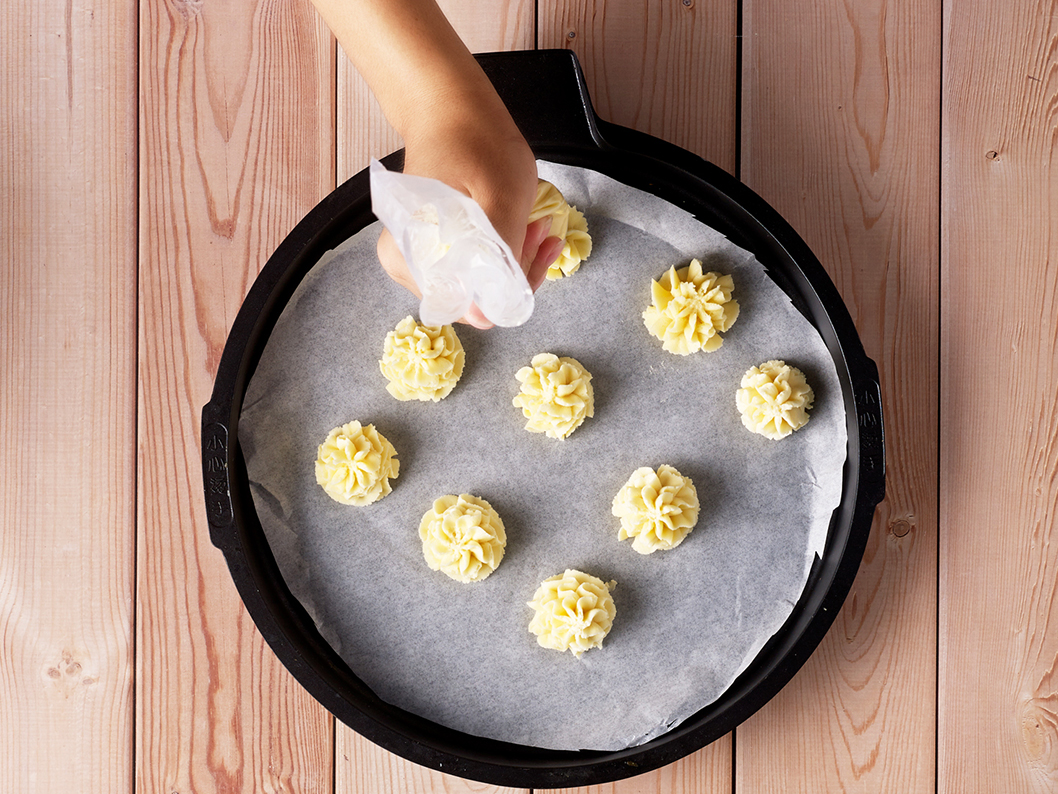3、將三種顏色的面糊分別放入裝有曲奇嘴的裱花袋里,烤盤鋪上烘焙紙,垂直方向擠出花形在烤盤上;