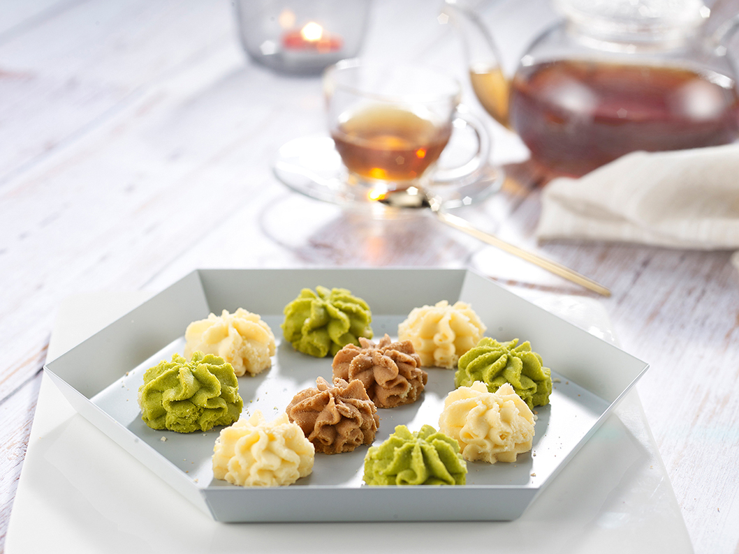 配料:黃油400g、糖粉60g、牛奶30克、鹽4克、奶粉40克、抹茶粉5克、可可粉5克、烘焙紙