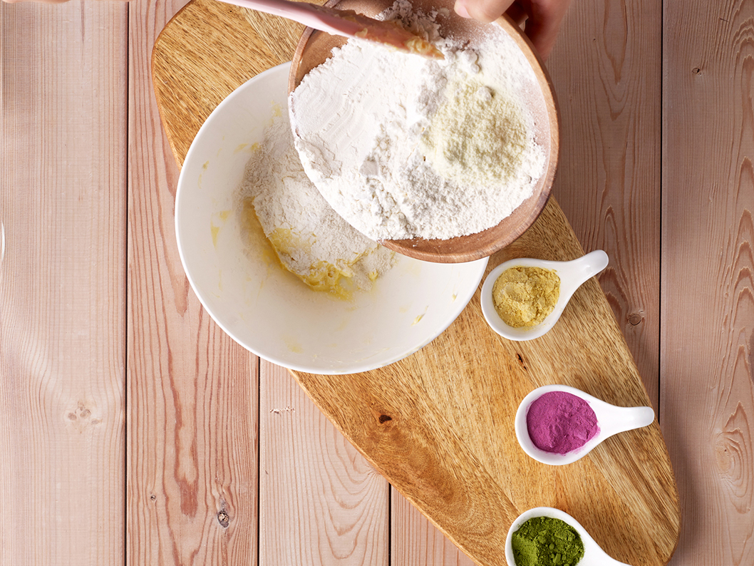 1、糯米粉均分4份,每份分別與不同果粉混合,加水揉成面團;