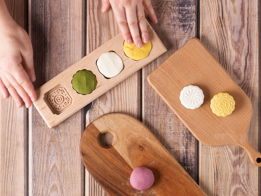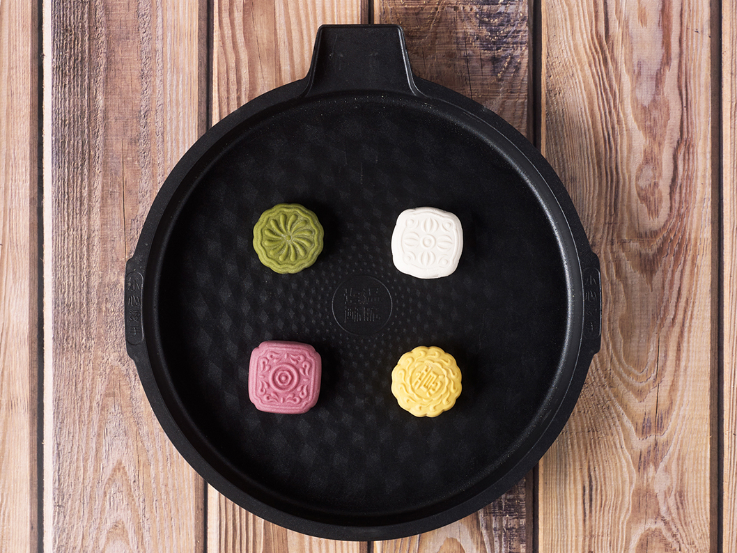 3、月餅模具撒一點月餅粉,將面團放入,按壓后取出月餅胚;