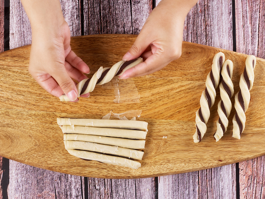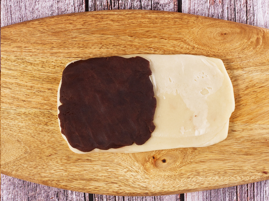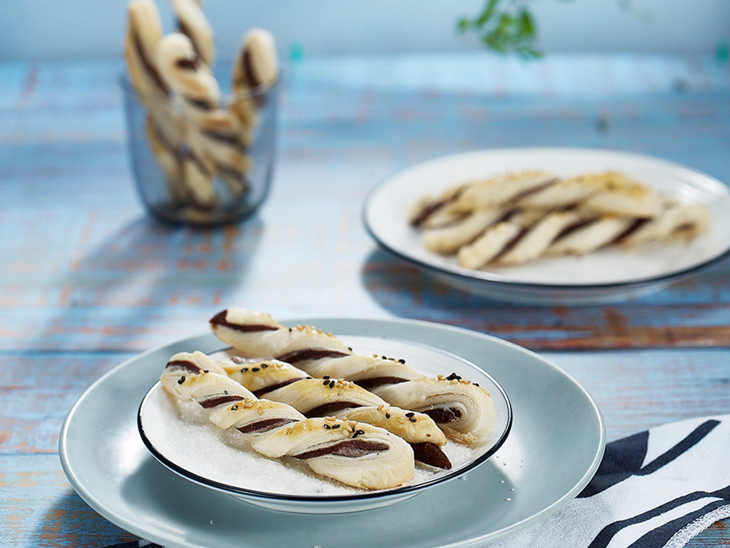5、用搟面杖將面團(tuán)搟薄,將豆沙鋪滿一邊,面皮對折,周邊切整齊,切成長條形狀,相反方向擰兩圈;