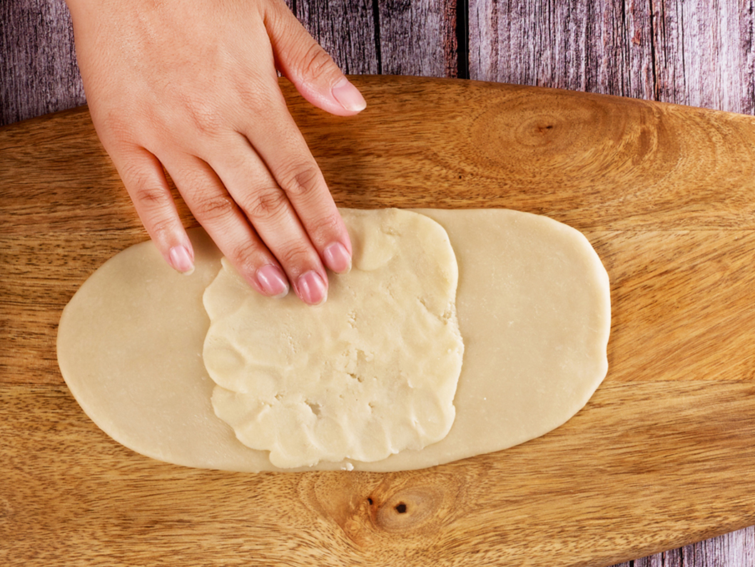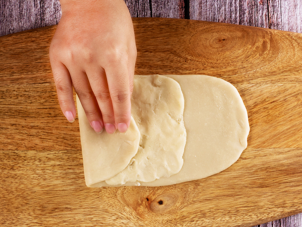 3、面團(tuán)搟成薄餅形,將油酥平鋪在面皮上,面片對折,壓緊邊緣;
