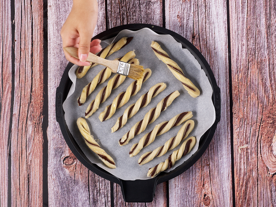 6、升降高度調(diào)節(jié)至20mm,選擇“鍋盔”功能,油紙放入烤盤,預(yù)熱結(jié)束后,將扭扭酥胚放入烤盤,刷蛋黃液,撒白芝麻,合蓋煎烤;