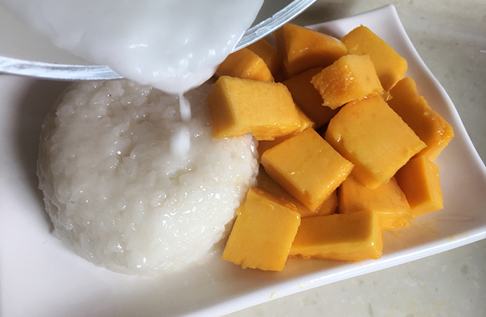 8、煮好的椰漿澆汁淋在芒果糯米飯上即可食用