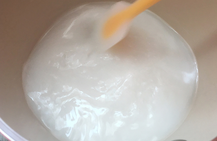 7、椰漿澆汁,鹽1g、粘米粉10g、椰汁200ml混合入小鍋內,中小火將椰漿煮開,不停地攪拌,煮沸至粘稠關火