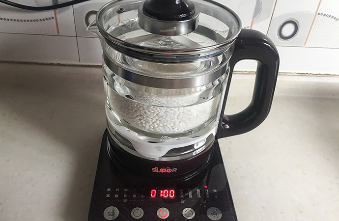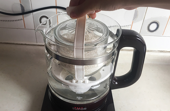 2、SUPOR/蘇泊爾SWF15S30A養生壺內注入純凈水800ml,浸泡好的糯米放入玻璃燉盅內,加同糯米一樣高度的純凈水,蓋上蓋子將燉盅架放入養生壺內