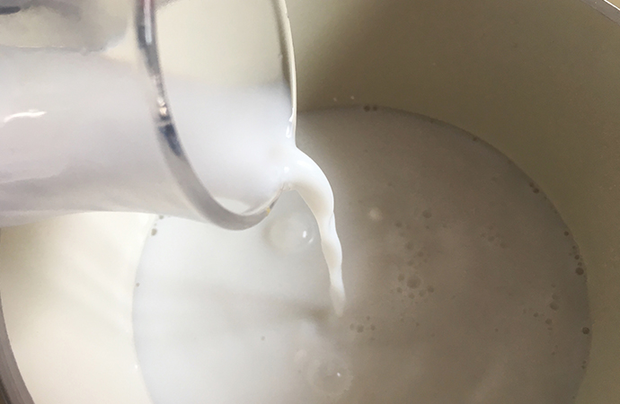 4、細砂糖60g、鹽4g加椰汁200ml,入鍋小鍋內,中火煮開,要不停地攪拌,至食材全部溶解