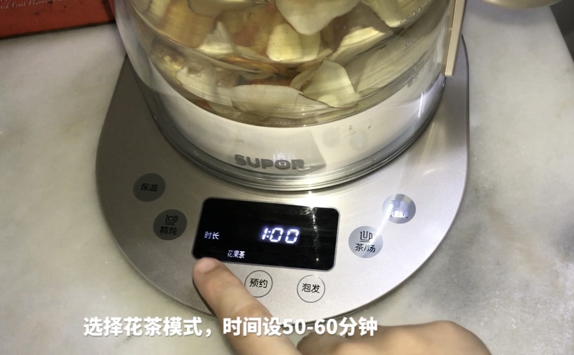 3.蓋上蓋子,選擇花茶模式,時(shí)間設(shè)定50分鐘,點(diǎn)開始即可。