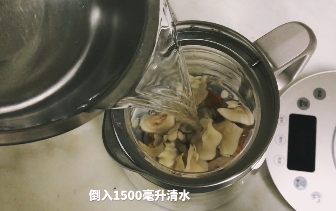 2.把所有材料放入養(yǎng)生壺里,并倒入1500毫升水