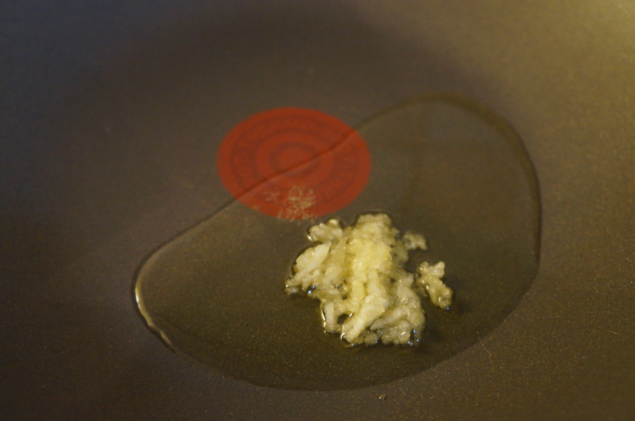 5. 熱炒鍋,放入剩余的油、蒜蓉,炒至聞到蒜蓉香氣。