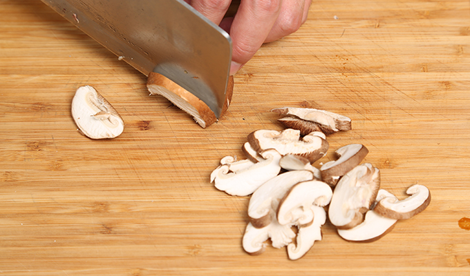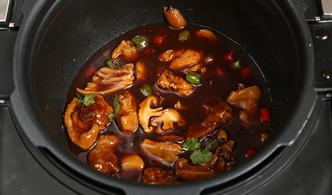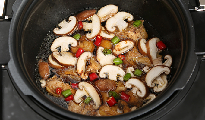 將香菇、雞腿肉、尖椒、水放入電壓力鍋,蓋上蓋子;燜燉。