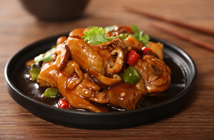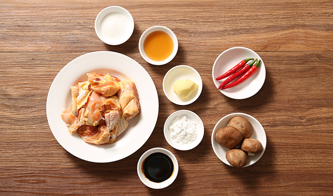 雞腿去骨,切塊洗凈備用;香菇用溫水泡軟,切條,青尖椒切成斜寬條備用。