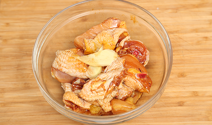 用醬油、鹽、糖、生粉、老抽、料酒、姜片腌制雞腿肉10分鐘。