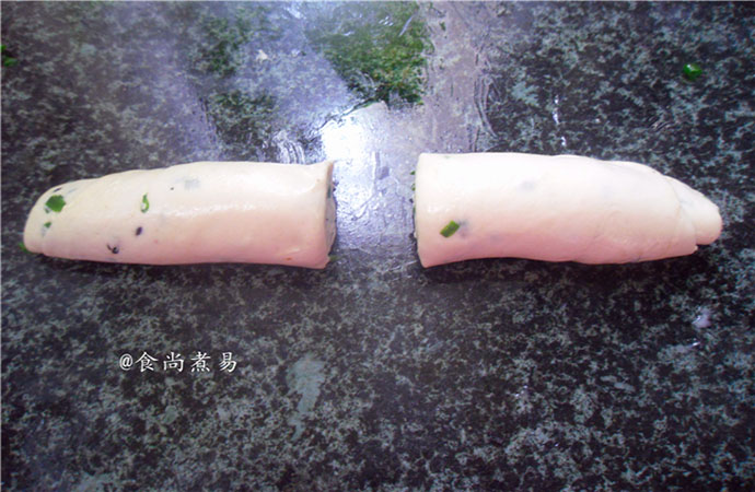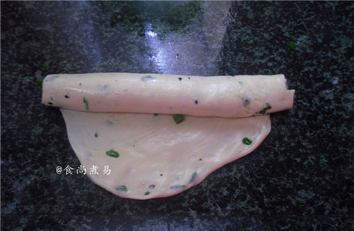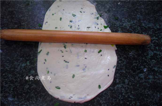 5.案板上涂抹一些自制香油,取出面團揉成薄薄的面皮,再涂抹一層香油,上面撒上一些蔥末,搟開;