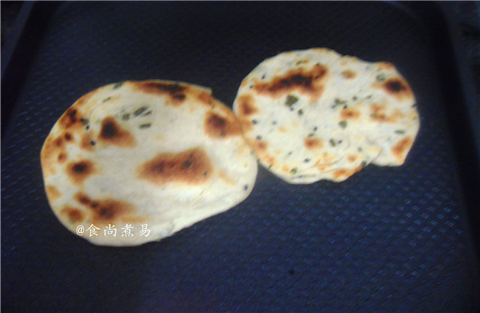 11.加入少量黑芝麻烙餅的口感更香,因搟面皮時已經混合上了香油,烙餅時煎盤不用加入食用油了。
