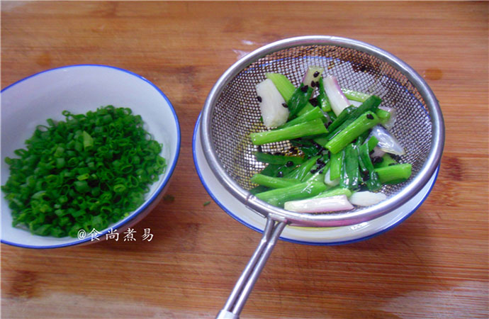 4.小蔥洗凈瀝干水,蔥梗切段,蔥葉切碎,鍋里燒熱適量油,待油溫高時,將黑芝麻和蔥梗部分炸香后過濾出香油待用;