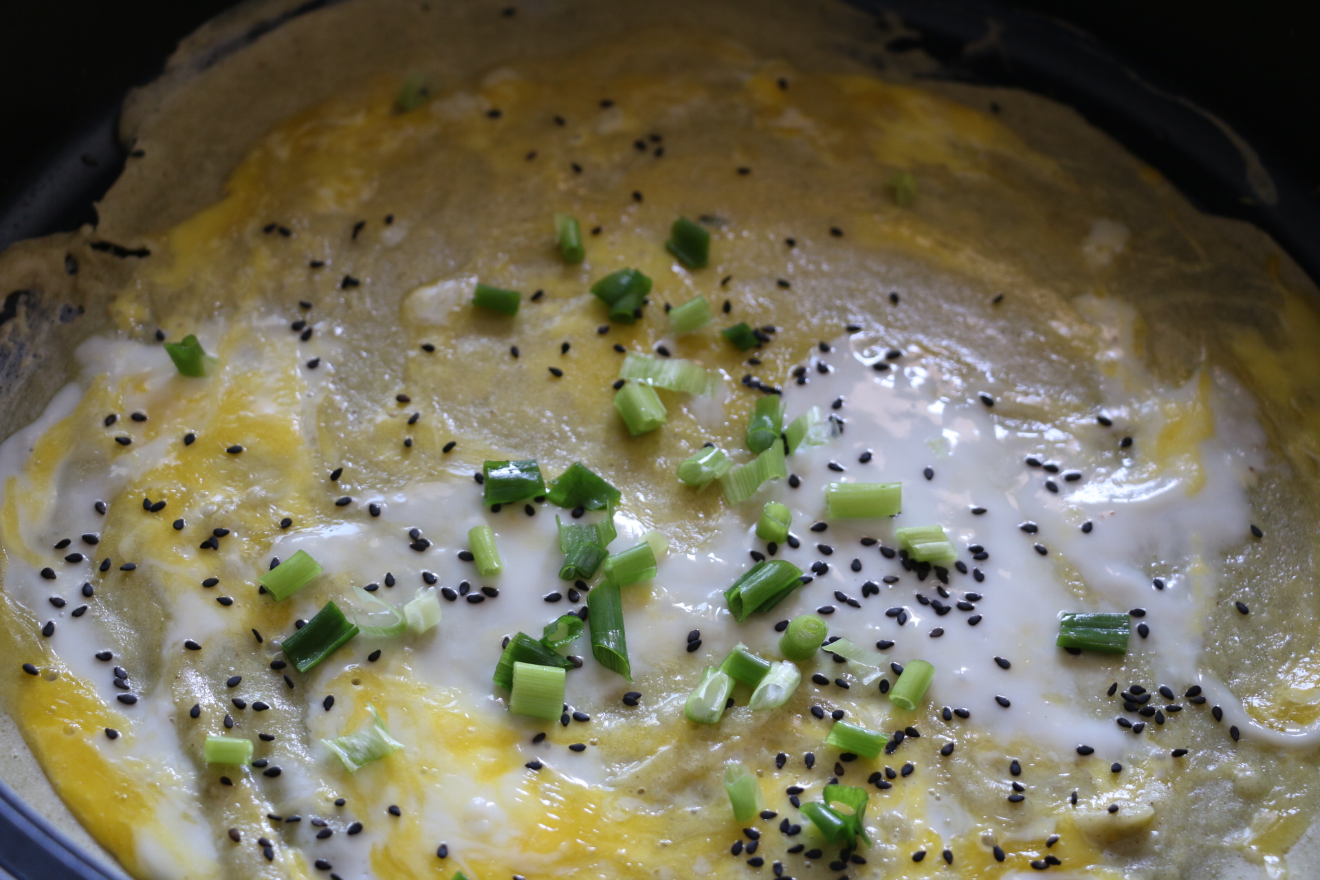 8.灑上黑芝麻、蔥花,半分鐘后翻面