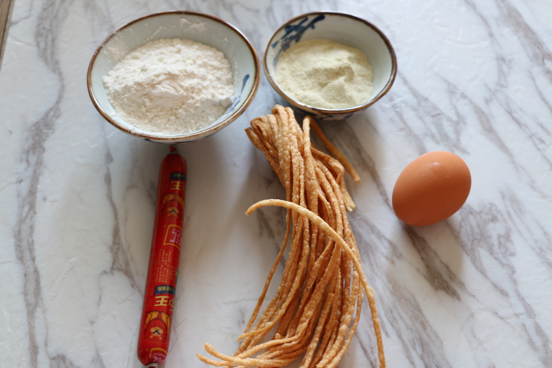 1.準備材料,油炸散子分成4份