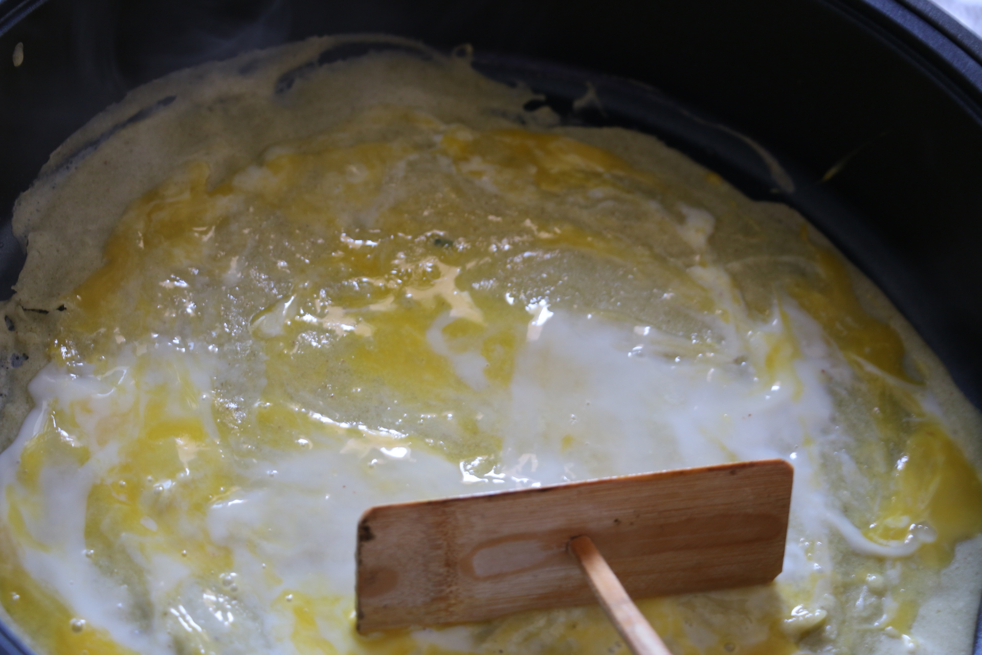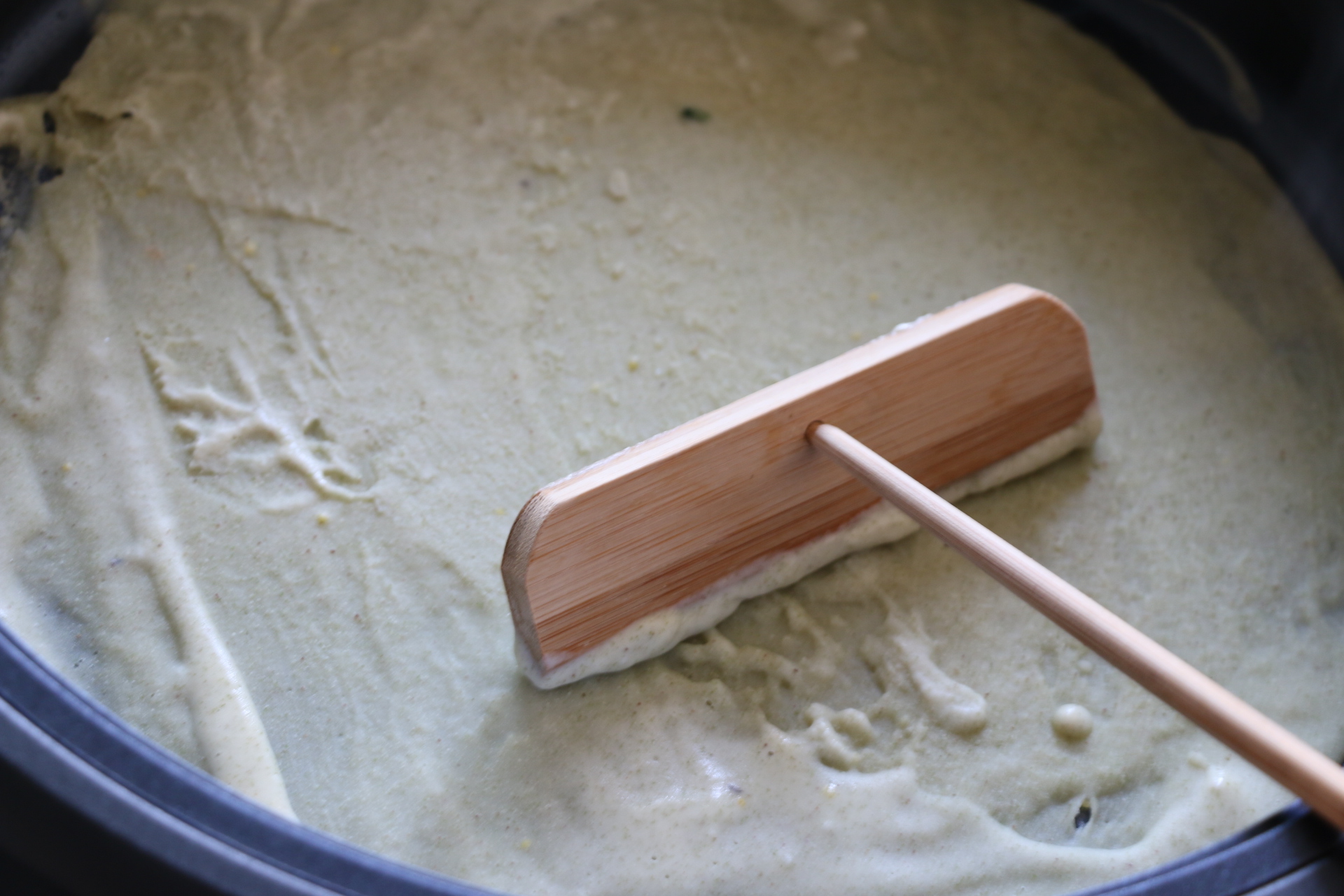 6.用煎餅耙子迅速刮勻,再調到小火檔,沒有煎餅耙子就雙手端起煎烤機迅速晃勻,把手是防燙的比較安全